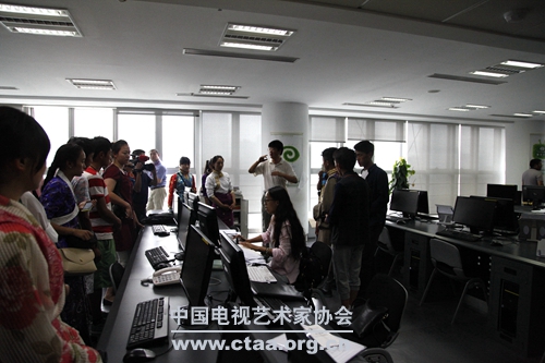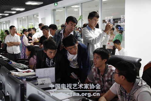 (孩子们在四川电视台参观,与电视工作者进行互动。)