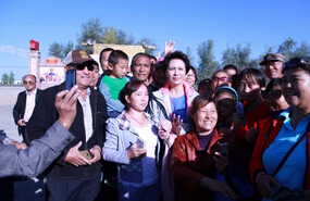 热情的七师广大职工群众和著名演员刘佳合影