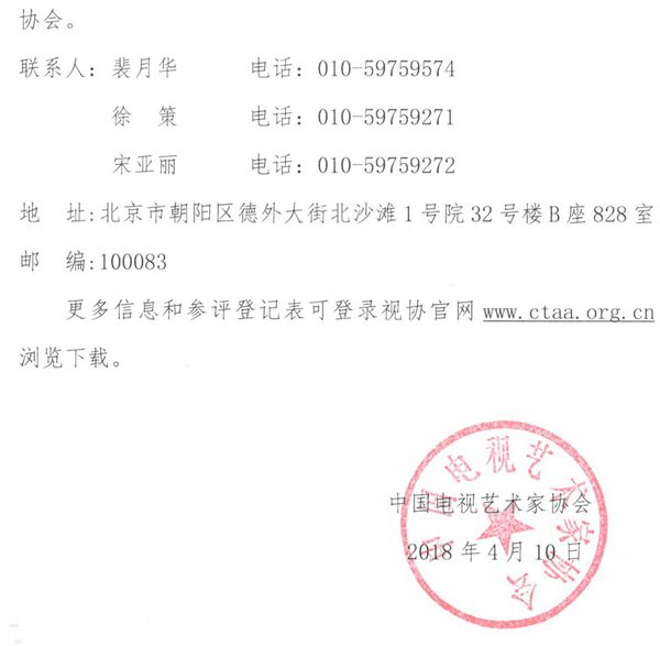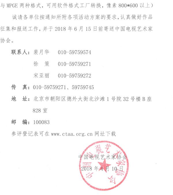 即日起至2018年6月16日,申报者须将全部申报材料电子版发送至邮箱bianju2018@163.com,并将全部申报材料打印两份寄送至中国视协青年编剧扶持计划办公室,邮寄地址:北京市朝阳区德胜门外北沙滩1号院32号楼B座8层,邮编:100083,邮寄时请在信封显著位置注明“青年编剧扶持计划申报材料”字样。